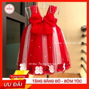 Đầm công chúa cho bé gái đỏ kim tuyến đính hoa nơ trắng