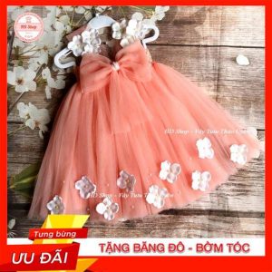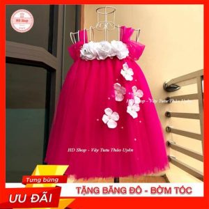 Váy công chúa cho bé gái hồng 10 giờ đính hoa hồng trắng 3 bông