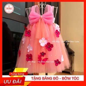 Váy công chúa cho bé gái hồng cam nơ đính hoa tú cầu và bướm